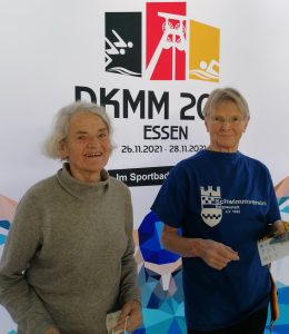 In der Altersklasse 75 gab es besonders wenige Teilnehmer, so trat über 50 m Freistil keine Schwimmerin an. In der AK 80 waren wir zu fünft, alle hatten schon irgendwann Meistertitel gewonnen und trotz der Erschwernisse der langen Pause nicht aufgegeben. Allerdings war ich die einzige Teilnehmerin des kleinen Mehrkampfes der Frauen, der aus 5 Teilen bestand. Die anderen Schwimmerinnen traten nur auf ihren Spezialstrecken an. So gewann ich die 100 m Lagen und 50 m Delphin im Alleingang mit unbefriedigenden Zeiten. Über 50 m Rücken, 50 m Freistil und 50 m Brust erreichte ich jeweils den zweiten Platz. In meiner Speziallage Brust schlug mich die 3 Jahre jüngere Elsbeth Flick mit einer Zeit, die ich ebenfalls mit 80 Jahren erreicht hatte. Aber ich war froh, dass wir wenigstens zu zweit waren und meine Zeit wie auch über 50 m Rücken noch unter der Minute blieb. Der Lagenmehrkampf bietet viele Möglichkeiten zur Disqualifikation, die vor allem die höheren Altersklassen traf. Dieses Mal hatte ich Glück, ich bestand die Stilwechsel mit ihren kompliziert festgelegten Wenden ohne Fehler und bekam im Alleingang den Titel im kleinen Mehrkampf wie schon 2018 in Freiburg.