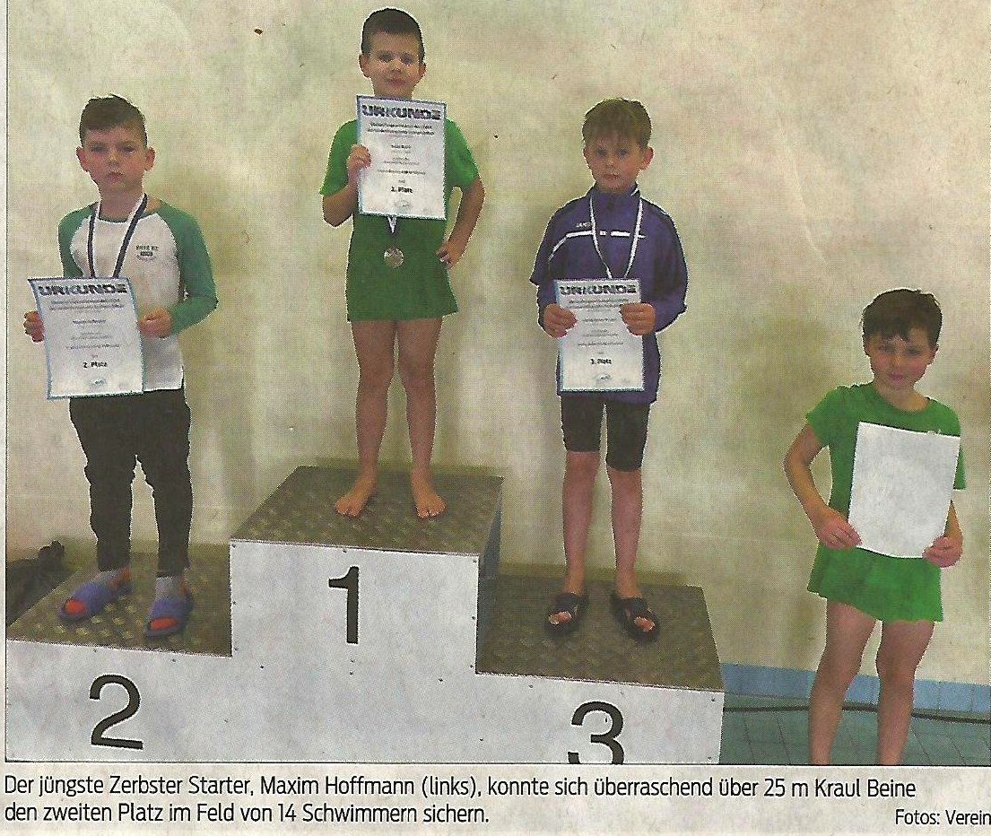 Ganz überraschend schaffte danach auch der jüngste Zerbster, Maxim Hoffmann, in 32,24 sec über 25 m Kraul Beine den zweiten Platz unter 14 Schwimmern im Jahrgang 2014.