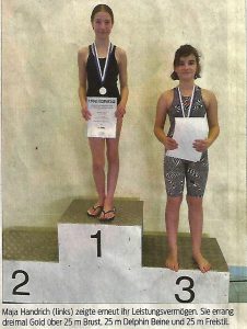 Maja Handrich kam zur zweiten Goldmedaille über 25 m Delphin Beine, die sie in 24,05 sec mit riesigem Vorsprung vor der Zweiten in 30,23 sec gewann.