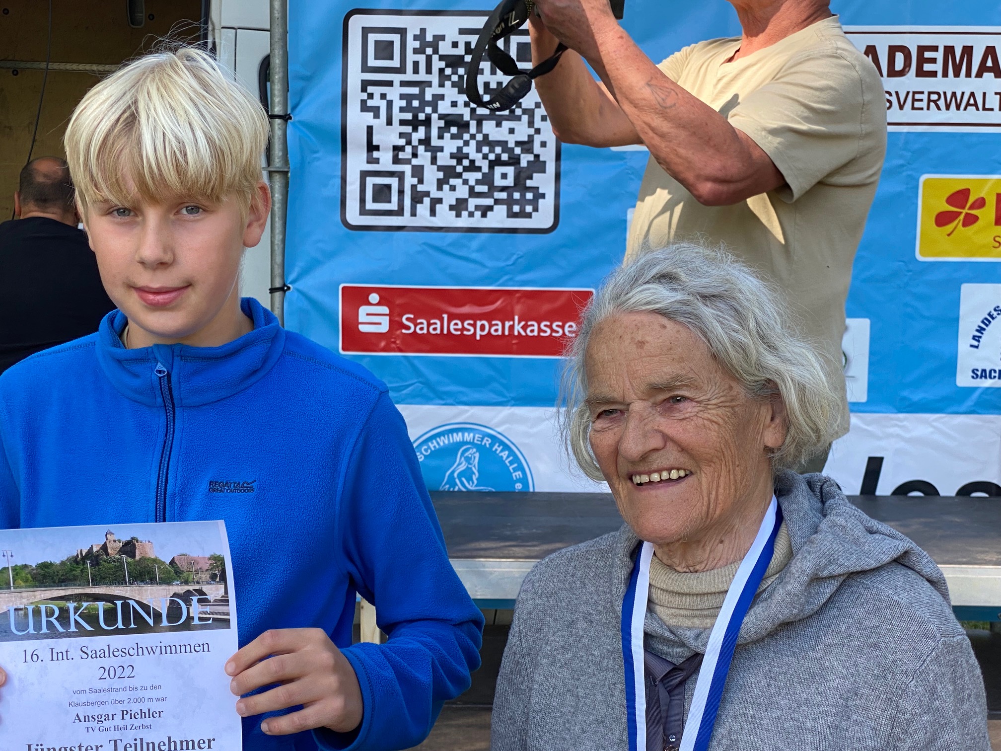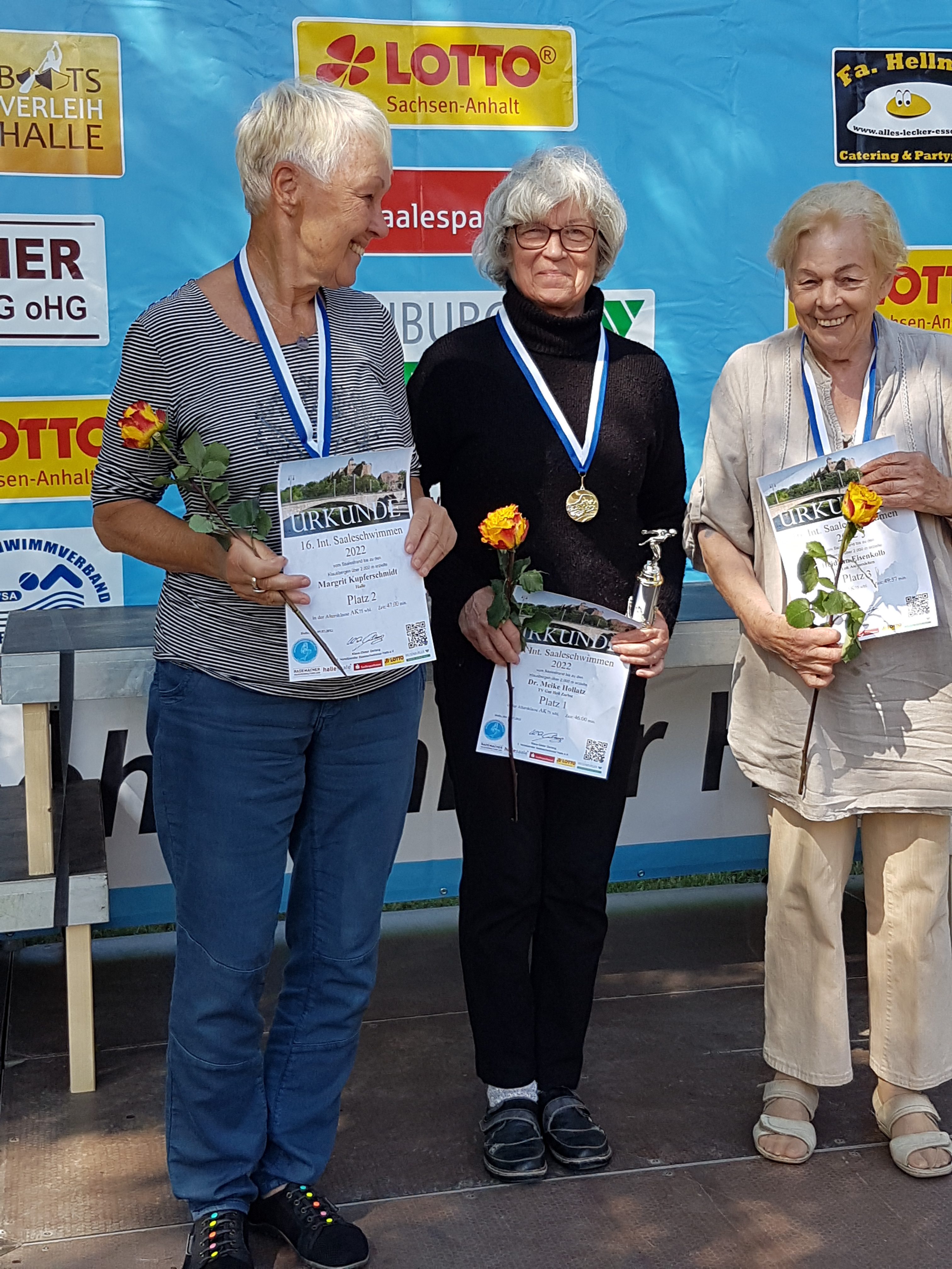 Zu unserem Erstaunen ergaben sich drei sichere Siege in verschiedenen Altersklassen. Dr. Meike Hollatz hatte wohlüberlegt ausgiebig im heimatlichen Pool trainiert, Annemarie Lüdicke im Zerbster Freibad, das sich allerdings auch nach Aufhören des Regens am Donnerstag verschlossen zeigte, und die beiden Piehler Brüder mit Jahreskarte im Meinsdorfer Freibad. Ansgar Piehler (Jg. 2010) war besonders fleißig, er begann mit 3 Kilometer täglich und steigerte sich dann sogar auf 4 Kilometer. Das machte sich bezahlt: in der Kinderklasse erreichte er mit 30.58 Minuten den Sieg und unter den 111 Männern Platz 39. Er schlug mit mehreren Minuten Vorsprung vor seinem großen Bruder, seinem Vater und seiner Trainerin an. Dr. Meike Hollatz schwamm zum zweiten Mal in der Saale, dieses Jahr war die volle Strecke von 2 Kilometer zu absolvieren und in der AK 75 der Frauen gab es erfahrene Konkurrenz. Sie kam dennoch sehr klar in 46 Minuten vor der Vorjahressiegerin Margrit Kupferschmidt in 47 Minuten und vor Heidrun Eisenkolb aus Aschersleben in 49.57 Minuten an. Annemarie Lüdicke freute sich nach dem deprimierenden Alleingang bei den deutschen Freiwassermeisterschaften (wo langsamere ältere Schwimmerinnen durch Zeitbegrenzung ausgeschaltet werden) beim „Gesundheitsschwimmen“ in der Saale, dass sie ihren Sieg – wenn auch im Alleingang in AK 80 – mit 36,18 Minuten im hinteren Mittelfeld des Gesamtwettkampfes beenden konnte, sie erreichte von 89 Schwimmerinnen immerhin Platz 54.