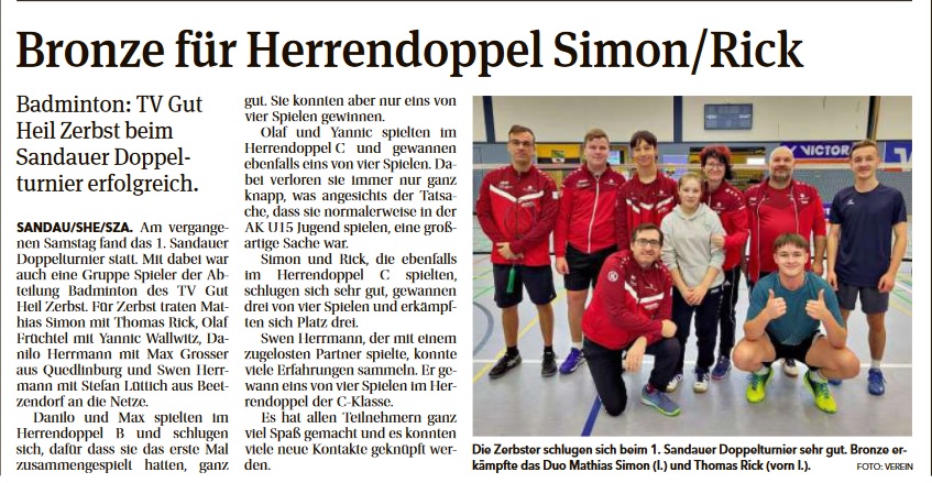 Für die Zerbster gingen Mathias W. und Tom in der C-Klasse an den Start. In der ersten Runde trafen sie auf ein Herrendoppel aus Magdeburg, nachdem sie schon 18:15 im 1. Satz geführt hatten, kamen sie beim Stand von 18:20 arg in Bedrängnis, behielten aber die Nerven und konnten auf 20:20 ausgleichen, ehe sie dann den Satz mit 22:20 gewinnen konnten. Die Zerbster nutzten den Rückenwind aus dem ersten Satz und entschieden den zweiten Satz mit 21:13 für sich. In der zweiten Spielrunde trafen Mathias und Tom auf eine Paarung vom TUS Haldensleben. Bis zur Mitte des ersten Satzes war das Spiel relativ ausgeglichen, danach konnten sich die Zerbster leicht absetzen und den Satz mit 21:16 für sich entschieden, im zweiten Satz riss beim Gegner früh der Faden, so dass dieser Satz mit 21:6 klar an die Zerbster ging. Auch in der dritten Spielrunde trafen die Zerbster auf zwei Spieler vom TUS Haldensleben, konnte sie aber mit 21:14 und 21:13 in Schach halten. In der vorletzten Spielrunde hießen die Spielgegner Nothnagel/Thon vom Flechtinger SV. Die Zerbster erwischten einen guten Start und konnten den ersten Satz mit 21:12 für sich entscheiden, doch dann drehten die Flechtinger gewaltig auf und die Zerbster mussten sowohl im zweiten als auch im dritten Satz permanent einen Rückstand hinterherlaufen, mit 17:21 und 17:21 ging das Spiel verdient verloren. In der fünften Spielrunde traf das Zerbster Herrendoppel wieder auf ein Team vom Flechtingen SV. Hochkonzentriert gingen Mathias und Tom in das letzte Match und gewannen verdient mit 21:8 und 21:12. Nach über 7 Stunden Badminton erkämpfte sich das Zerbster Herrendoppel den 2. Platz in der C-Klasse.