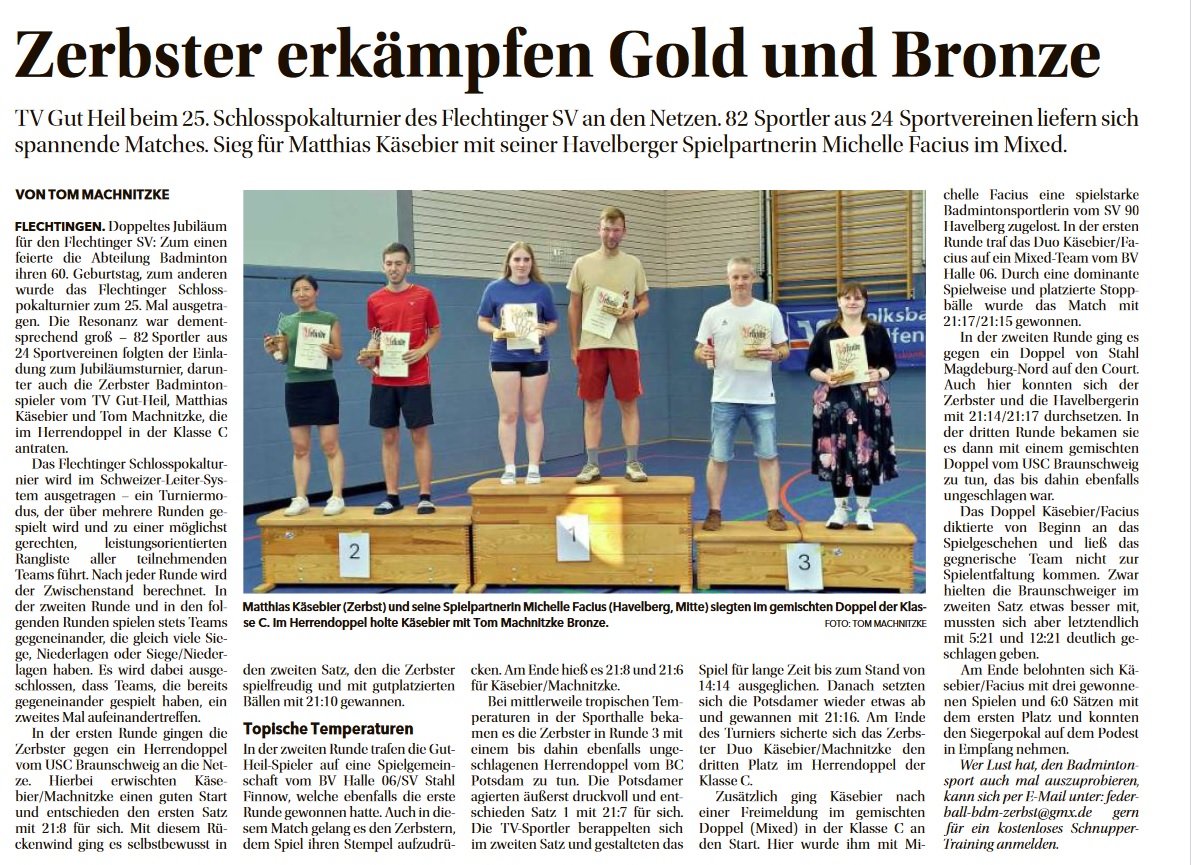 Nach zwei Jahren Corona-Zwangspause fand in diesem Jahr wieder das Flechtinger Schlosspokalturnier statt. Im Herrendoppel der Klasse C (Freizeitspieler) gingen zwei Zerbster Teams an den Start. Gespielt wurde im Modus „Schweizer-Leiter-System“: