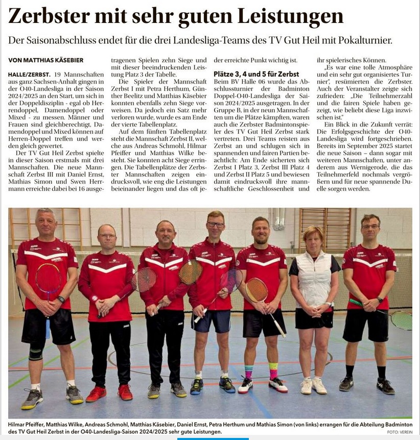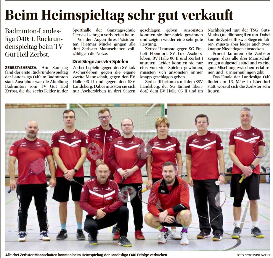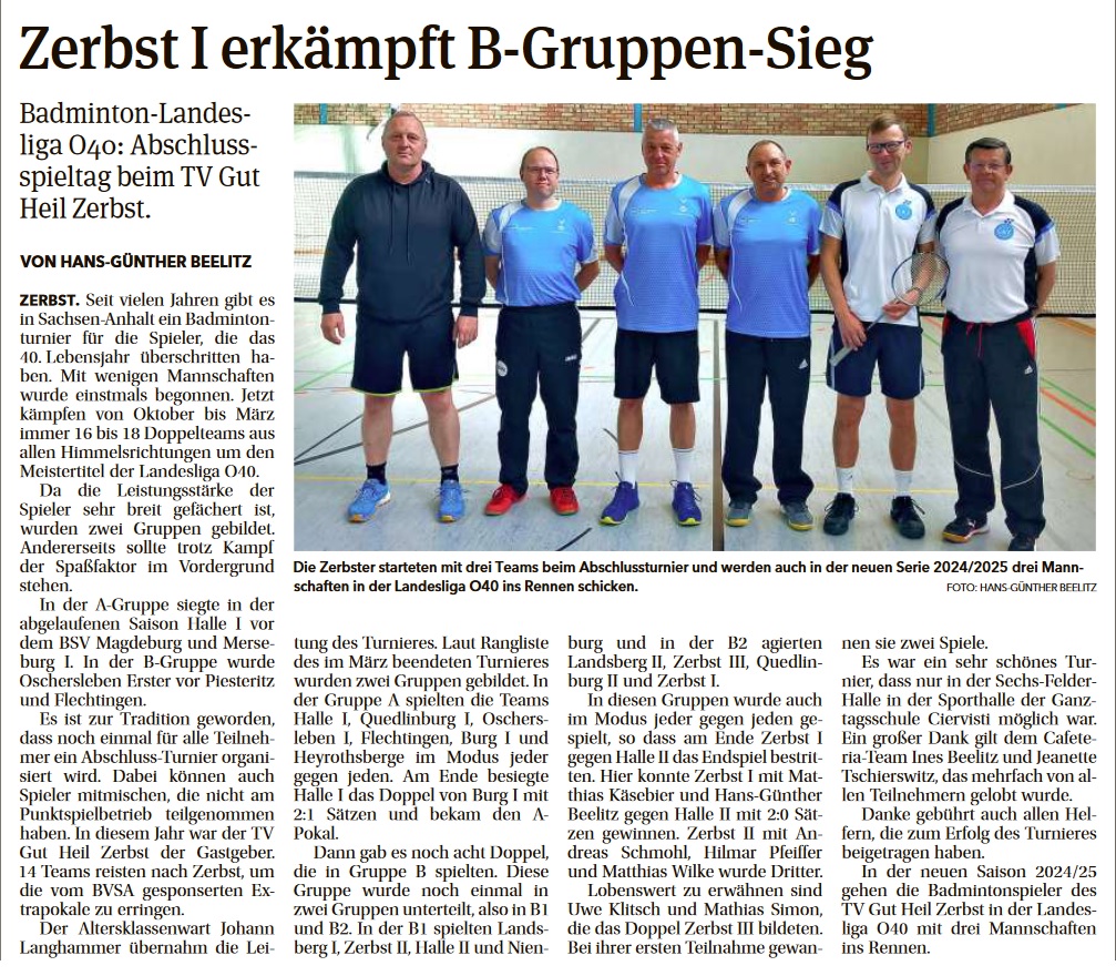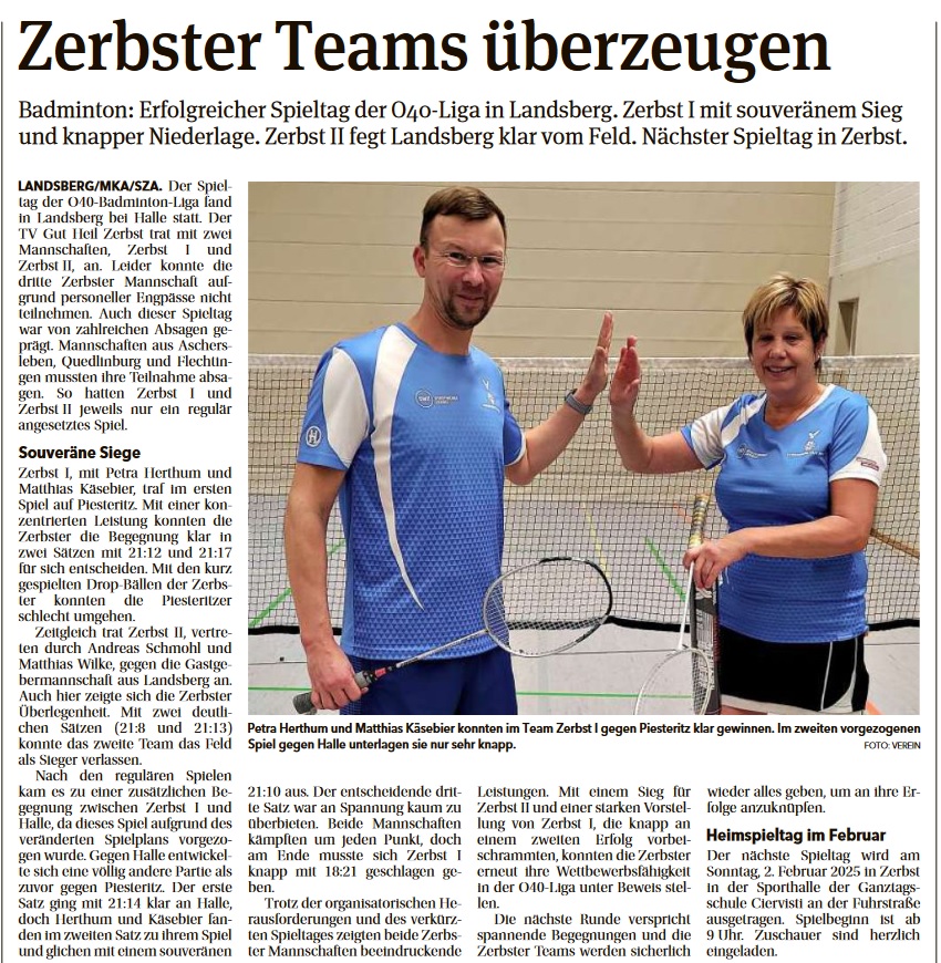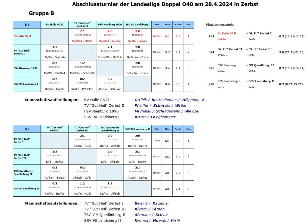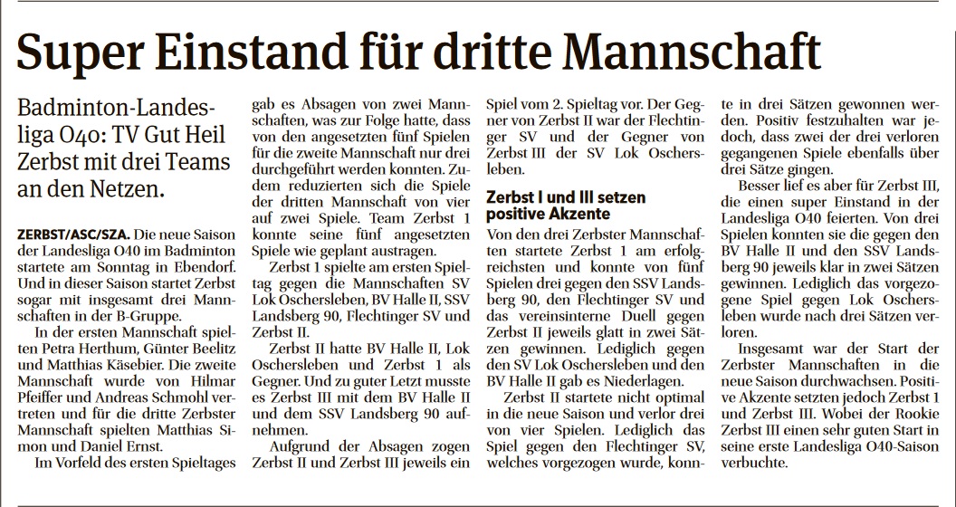 VfB Merseburg – TV „Gut Heil“ Zerbst I 2:0 (21:17 / 21:16)VfB Merseburg – TV „Gut Heil“ Zerbst II 2:0 (21:16 / 21:16)- TV „Gut Heil“ Zerbst I – SV Lok Oschersleben 1:2 (11:21 / 21:19 / 11:21)