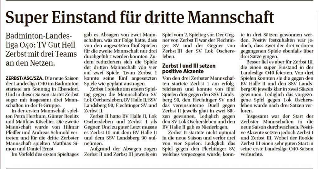 - TV „Gut Heil“ Zerbst II – TV „Gut Heil“ Zerbst I 1:2 (14:21 / 21:18 / 14:21)
