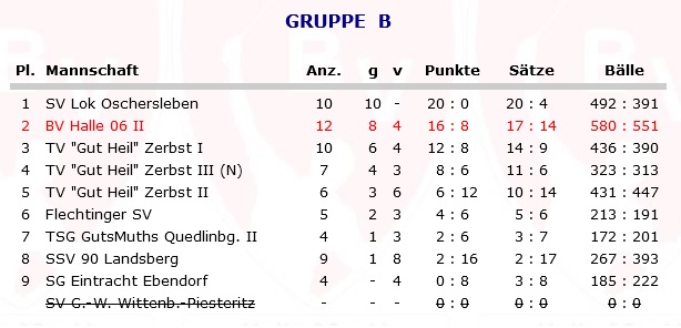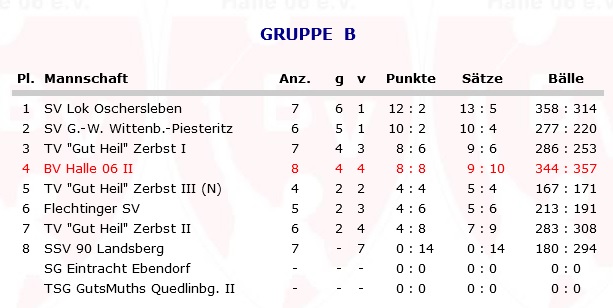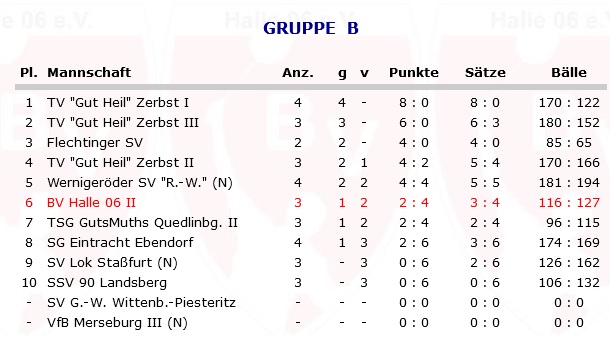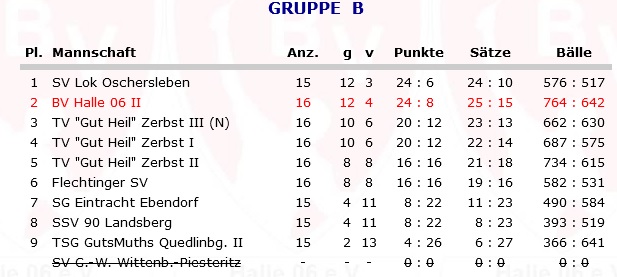 - BV Halle 06 II – TV „Gut Heil“ Zerbst III 2:1 (15:21 / 21:16 / 21:10)