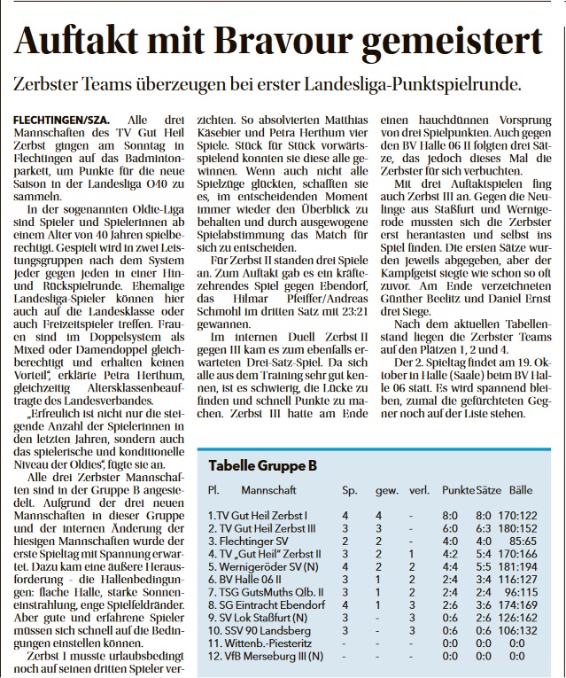 - TV „Gut Heil“ Zerbst II – Flechtinger SV 2:1 (21:15 / 12:21 / 21:17)