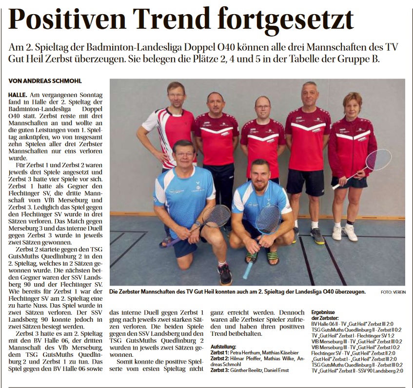 VfB Merseburg – TV „Gut Heil“ Zerbst I 2:0 (21:17 / 21:16)VfB Merseburg – TV „Gut Heil“ Zerbst II 2:0 (21:16 / 21:16)- TV „Gut Heil“ Zerbst I – SV Lok Oschersleben 1:2 (11:21 / 21:19 / 11:21)