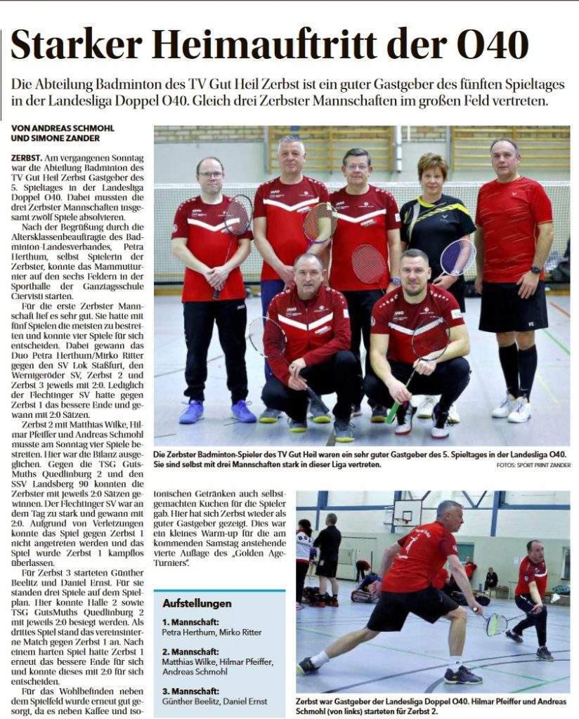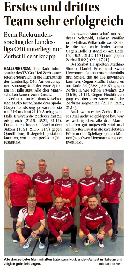 VfB Merseburg – TV „Gut Heil“ Zerbst I 2:0 (21:17 / 21:16)VfB Merseburg – TV „Gut Heil“ Zerbst II 2:0 (21:16 / 21:16)- TV „Gut Heil“ Zerbst I – SV Lok Oschersleben 1:2 (11:21 / 21:19 / 11:21)