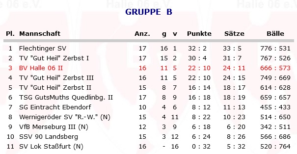- BV Halle 06 II – TV „Gut Heil“ Zerbst III 2:1 (15:21 / 21:16 / 21:10)